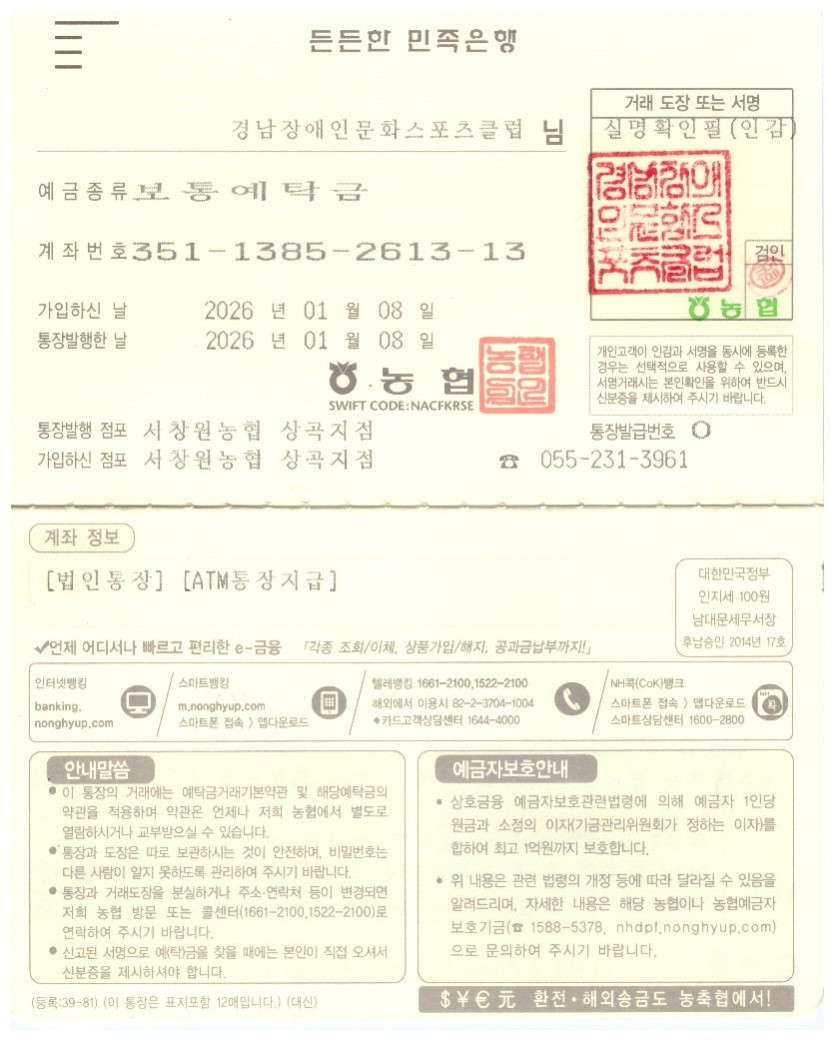 GDCSC-회원회비 통장사본 페이지 정보 작성자 경남장애인문화스포츠클럽 댓글 0건 조회 8회 작성일 26-02-23 11:10 목록 본문 GDCSC-회원회비 통장사본 이전글후원통장사본 26.02.23 다음글문서자료실 입니다. 26.02.08 댓글 0 댓글목록 등록된 댓글이 없습니다.