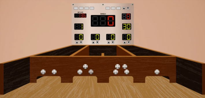 ○ 2m 길이의 슐런 보드 위에서 30개의 퍽을 3차례에 걸쳐 밀어 넣습니다. 관문은 총 4개이며, 각 게이트에 퍽이 들어가면 해당 점수(왼쪽부터 2, 3, 4, 1점)를 얻습니다.